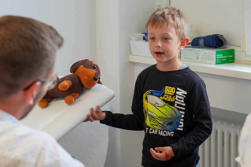 Insgesamt gab es an dem Vormittag fünf Stationen, an denen die Kinder spielerisch die Welt der Medizin entdecken konnten: Ultraschall, Verbände und OP, Impfungen, Notruf sowie Rettungswagen. Und auch die Kinder hatten sich auf diesen Tag vorbereitet. Sie betraten die Praxis mit einem Versichertenkärtchen in der Hand – also so, wie es für einen Arztbesuch normal ist. Nachdem die medizinische Fachangestellte Sandra Hohoff-Wintgen die Karten in Empfang genommen hatte, fragte sie nach den Beschwerden der Kuscheltiere. Der kleine Tim antwortete: „Hundi ist vom Fünfmeterturm gesprungen und mit dem Kopf auf dem Beckenrand gelandet.“ Also ging es für Tim und Hundi zur medizinischen Fachangestellten Lisa Kreß, die erst einmal erklärte, wie wichtig es ist, bei Unfällen wie diesen sofort einen Notruf abzusetzen – und sich dann um Hundi kümmerte und ihn verarztete.